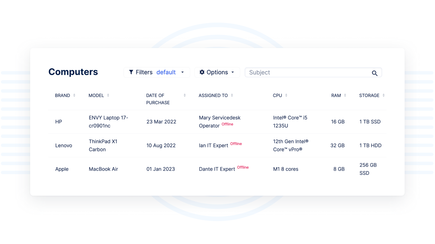 Správa počítačů, routerů, tiskáren a identifikace jejich uživatelů i správců. Díky našemu doplňku optimalizujete proces správy i údržby hardwaru a zajistíte evidenci jeho historie. Mějte všechny informace o hardwaru vaší společnosti na jednom místě.