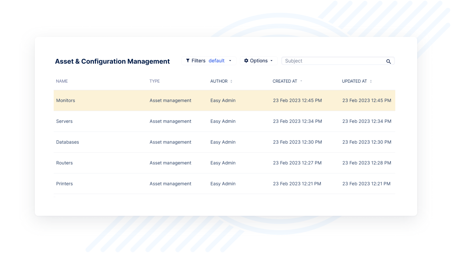 Ovládejte svá data centralizovaně pomocí vlastní databáze pro správu konfigurací a řešení ITIL. Vytvářejte vlastní datová pole, vymýšlejte jedinečné datové struktury, používejte filtry a pohledy, které usnadňují čtení a interpretaci dat. Díky možnosti propojení dat s úlohami také zajistíte, že všechna vaše aktiva a konfigurace budou aktuální a dostupná na jednom místě.