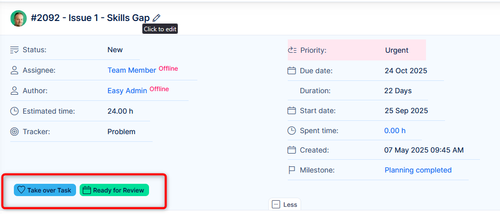 - Převzít úkol: nastavte příjemce a vlastníka tiketu na sebe a změňte stav na Přiděleno (což spustí První odpověď a může odeslat automatický e-mail)