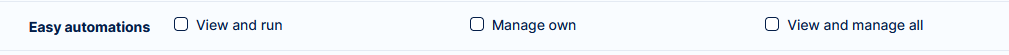 Práva pro automatizační tlačítka se nastavují pro jednotlivé uživatelské role nebo pro jednotlivé uživatele. Práva jednotlivých uživatelů mají přednost před právy uživatelských rolí. Typy práv pro tlačítka automatizace jsou: Zobrazit všechna tlačítka, Správa vlastních tlačítek, Správa všech tlačítek.