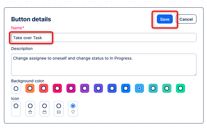 Kliknutím se otevře plátno pro vytvoření automatizace. Zde vás přivítá obrazovka Podrobnosti o tlačítku, kde můžete zadat název a popis tlačítka a přizpůsobit jeho vzhled výběrem barvy a ikony.
