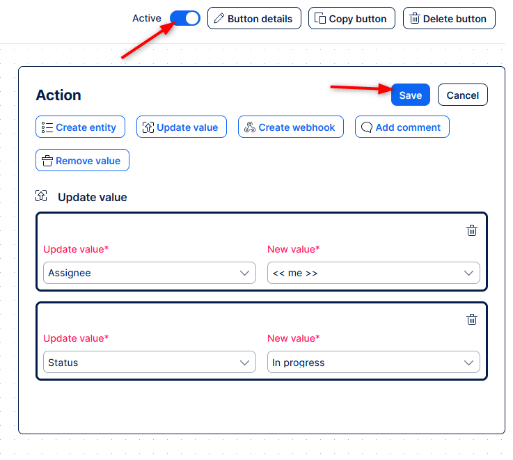 Co se týče akcí, automatizační tlačítka mohou aktualizovat atributy úkolu, na který se kliká, mohou tam vkládat komentáře, mohou vytvářet podúkoly nebo související úkoly ze šablony nebo volat webhook.