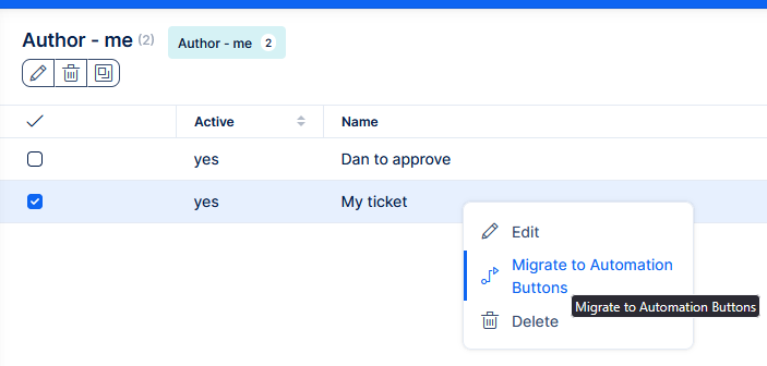 Migrace z Easy tlačítek na nová tlačítka je možná a lze ji provést tak, že přejdete do seznamu Easy tlačítek, najedete na jednotlivá tlačítka, kliknete na 3 tečky a poté se zobrazí možnost „Migrovat“, po jejímž kliknutí se vytvoří Automatizační tlačítko se stejnými podmínkami viditelnosti a akcemi jako Easy tlačítko. Migrovat lze pouze Easy tlačítka použitá na entitu úkol. Pokud se vyskytnou problémy s migrací, překontrolujte prosím svá práva a nastavení tlačítek.