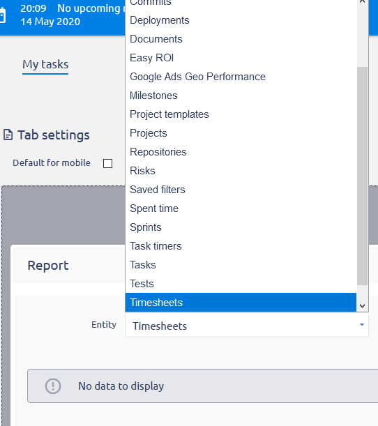Modul "Výkaz" na personalizované stránce obsahoval v nastavení možnost přidat nepodporované entity, jako jsou pracovní výkazy (timesheets). V takovém případě nebyla v modulu zobrazena žádná data.