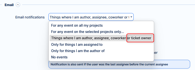 Uživatel vybraný jako vlastník tiketu (toto pole existuje pouze s Help deskem) může nově dostávat e-mailová oznámení.
