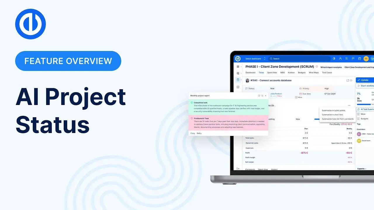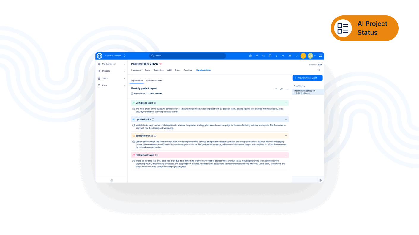- Zjednodušení projektových statusů: Ušetřete cenný čas od repetitivní práce a zapojte asistenta k generování statusů.