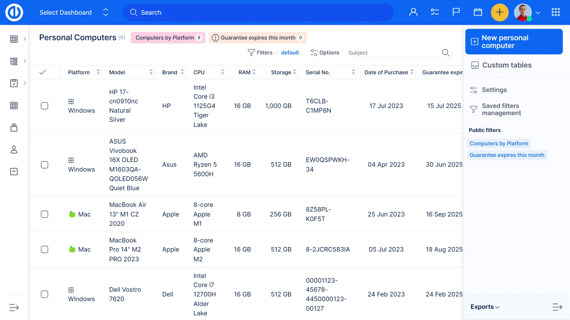- Správa hardwarového inventáře - spravujte počítače, routery, tiskárny, kdo je používá, kdo je udržuje a historii údržby.