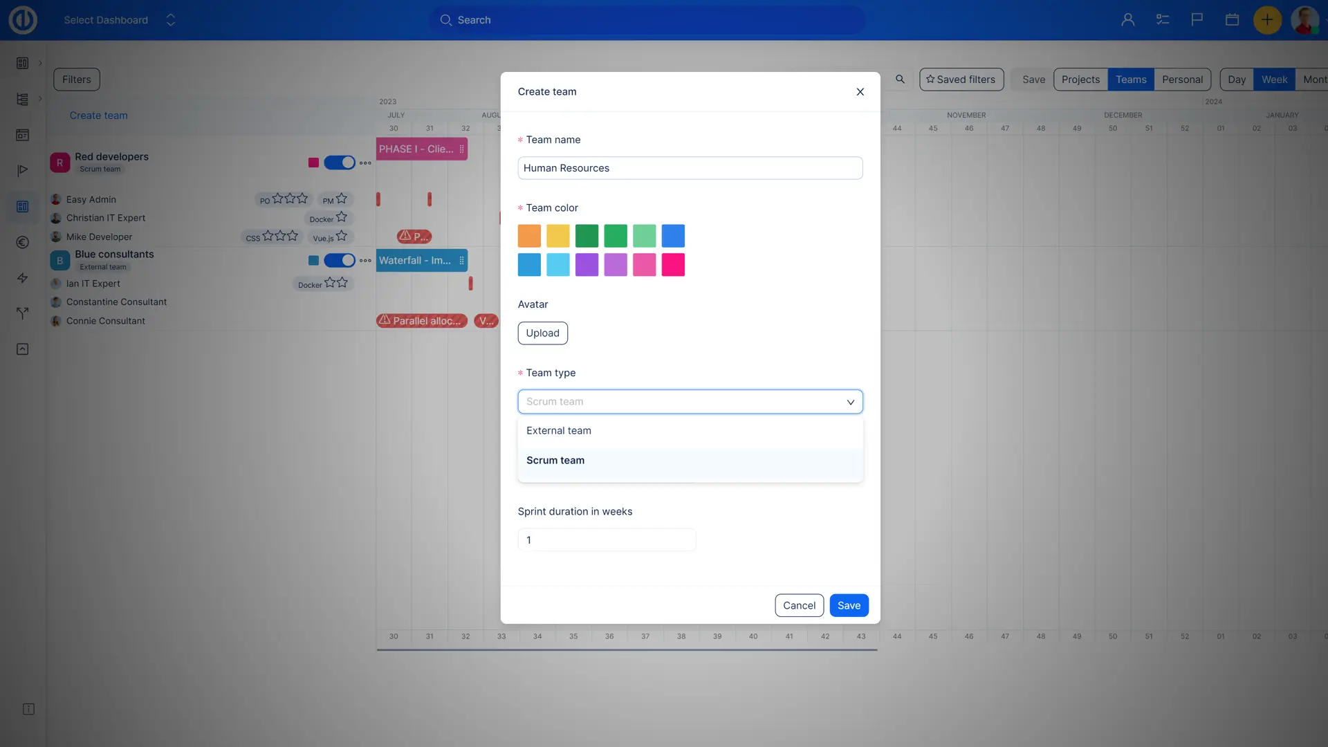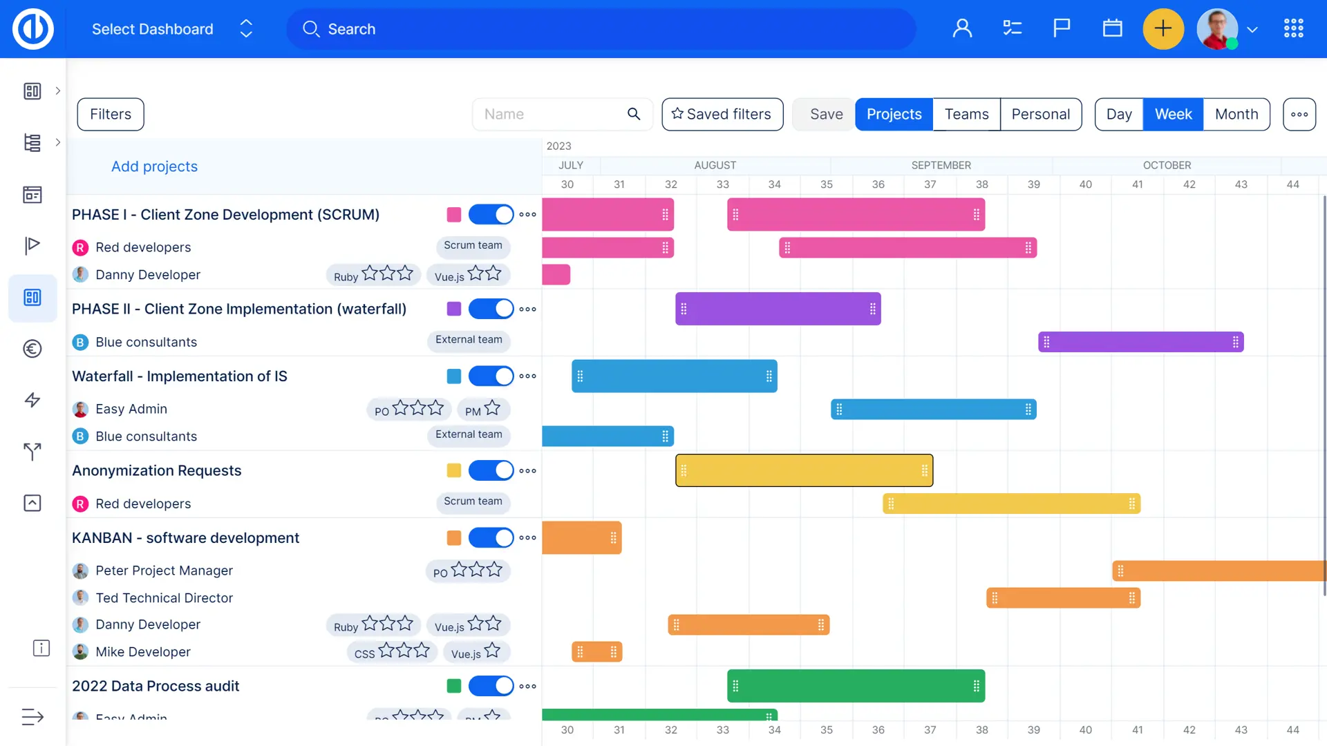 - Pouze základní dimenze (projekt, týmy, pracovníci, čas)