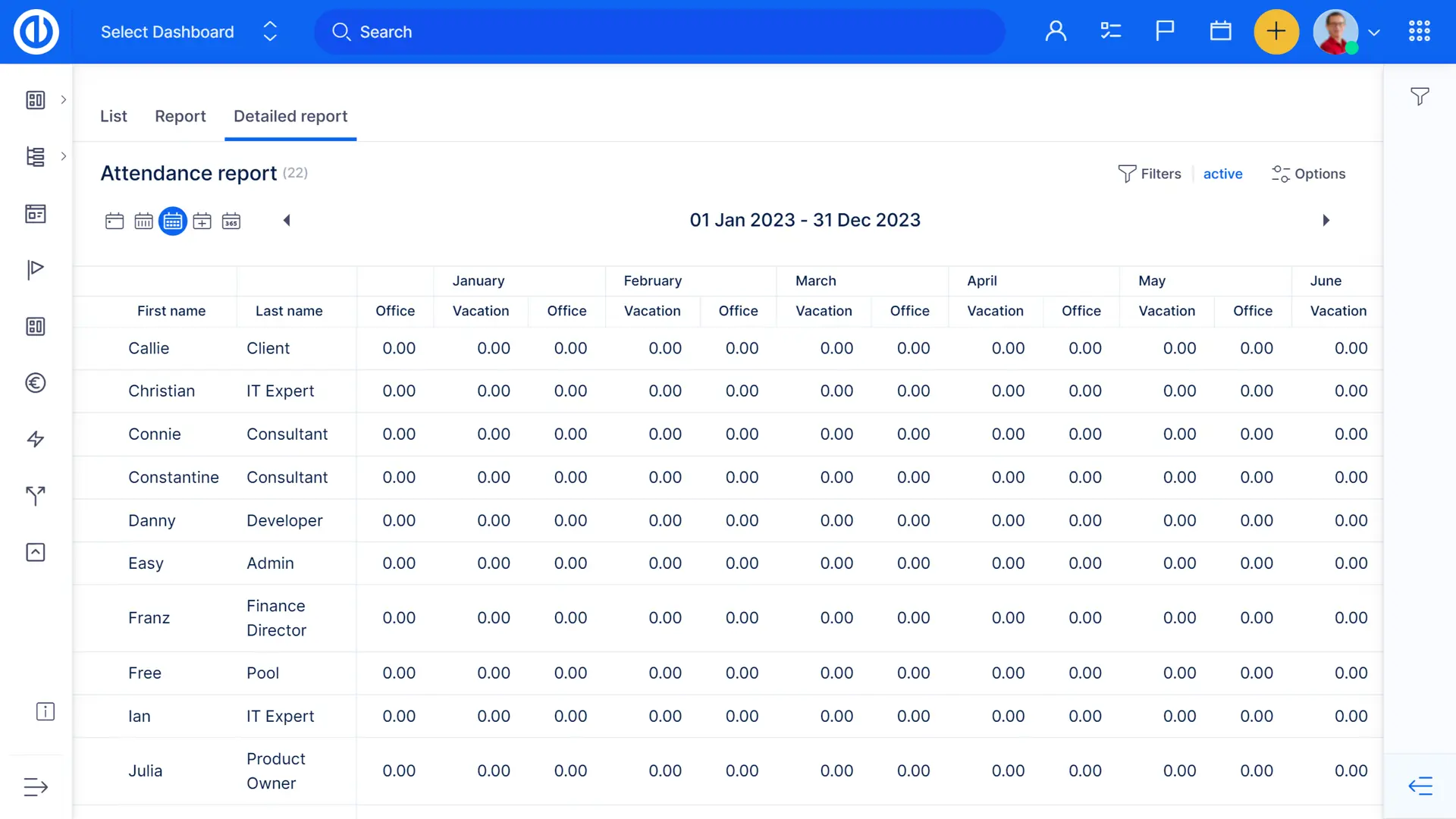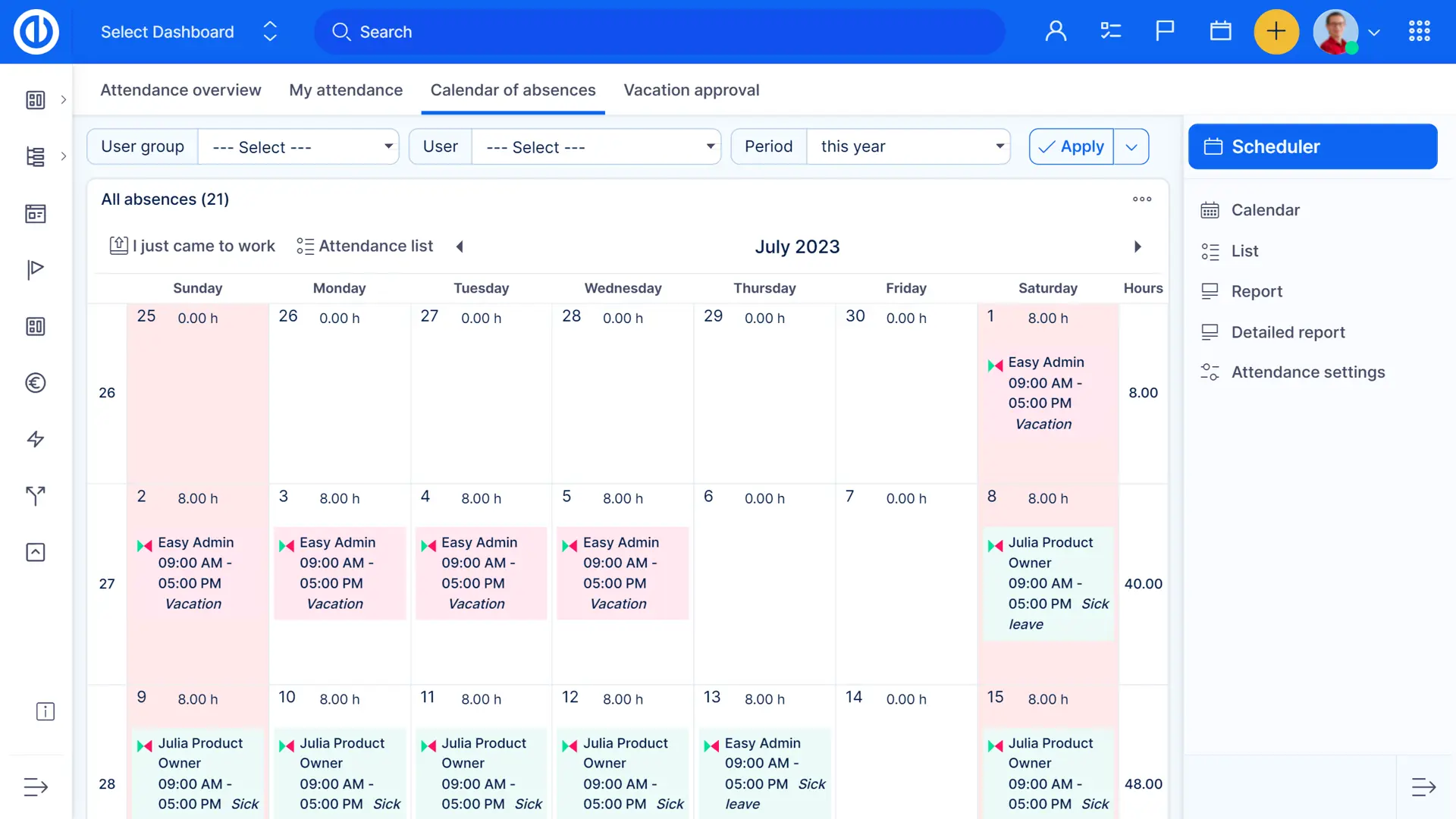 - zobrazení docházky pracovníků v seznamu, kalendáři nebo statistickém přehledu
