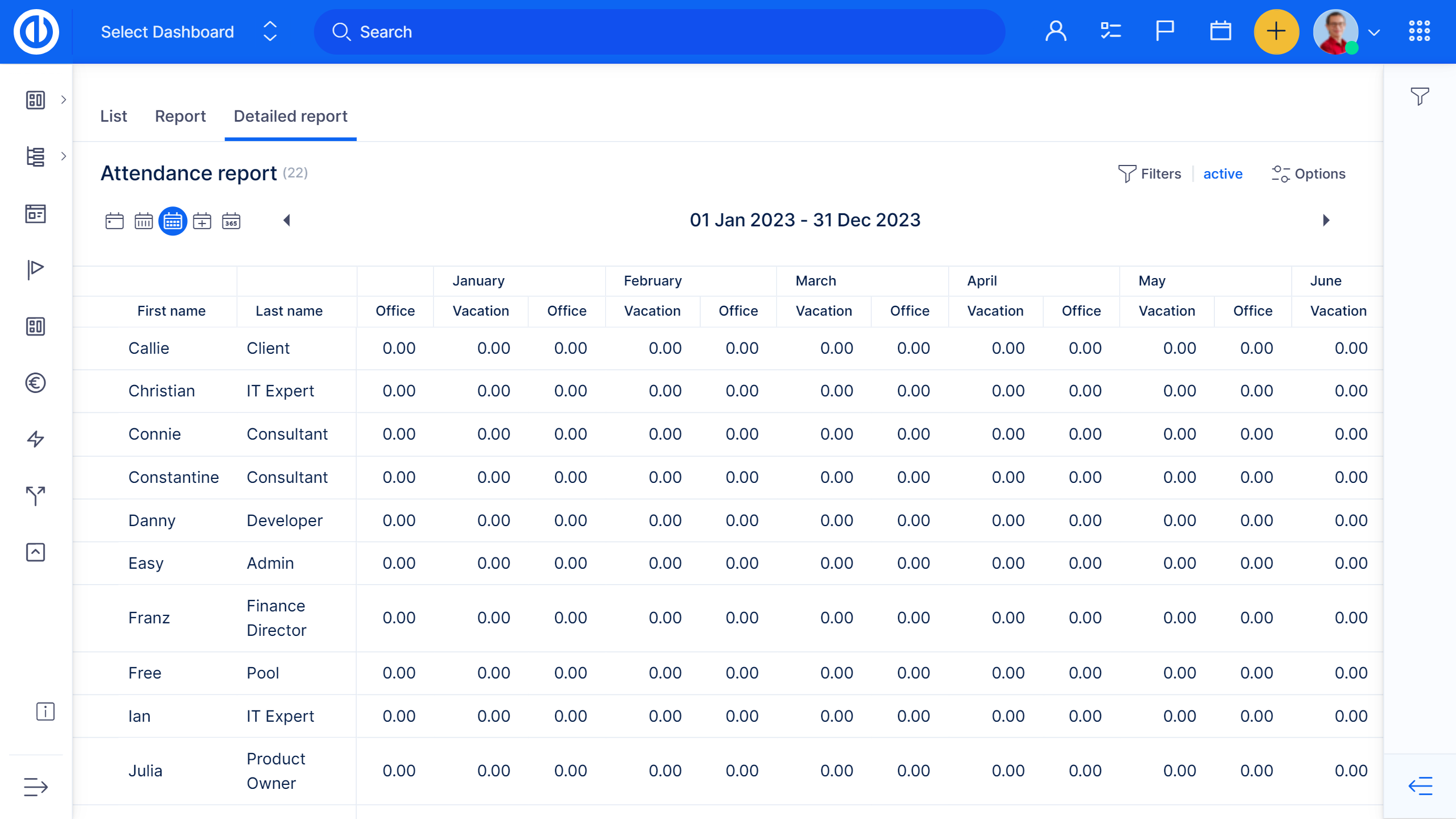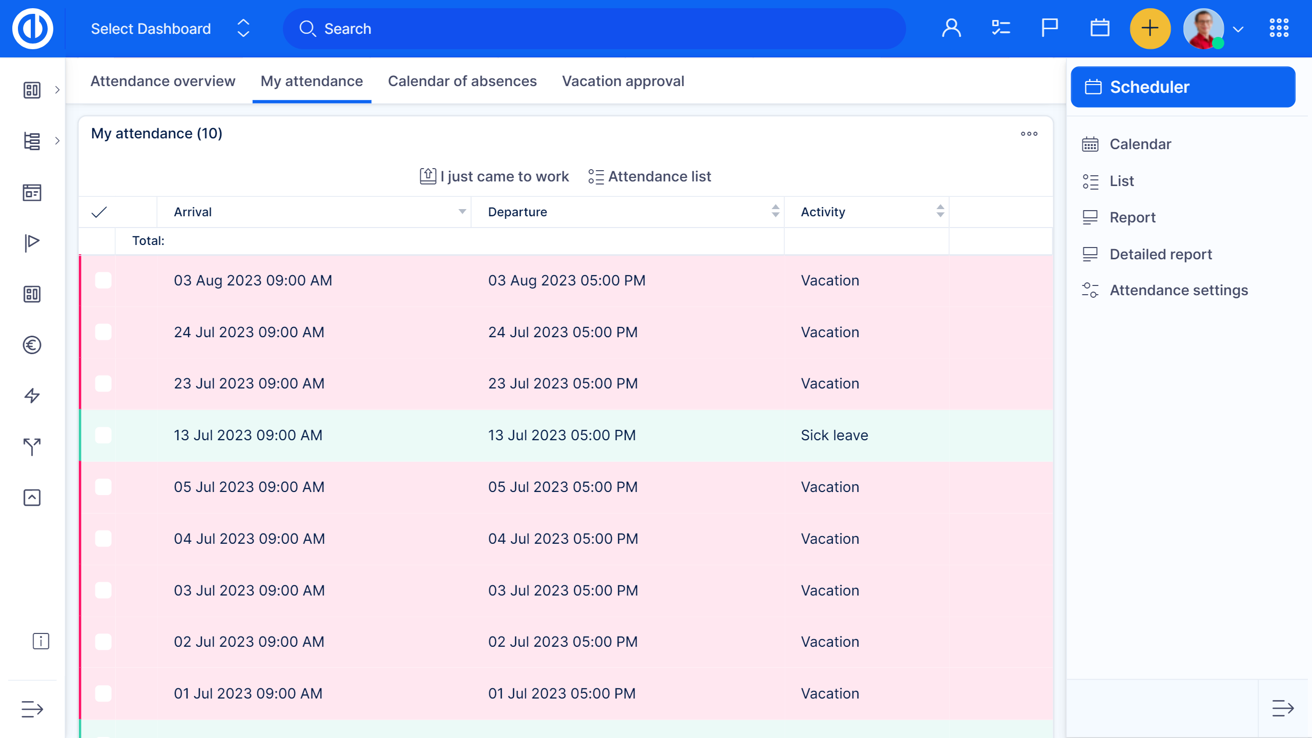 - zobrazení docházky pracovníků v seznamu, kalendáři nebo statistickém přehledu