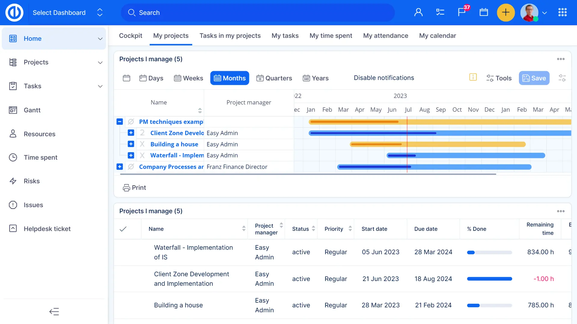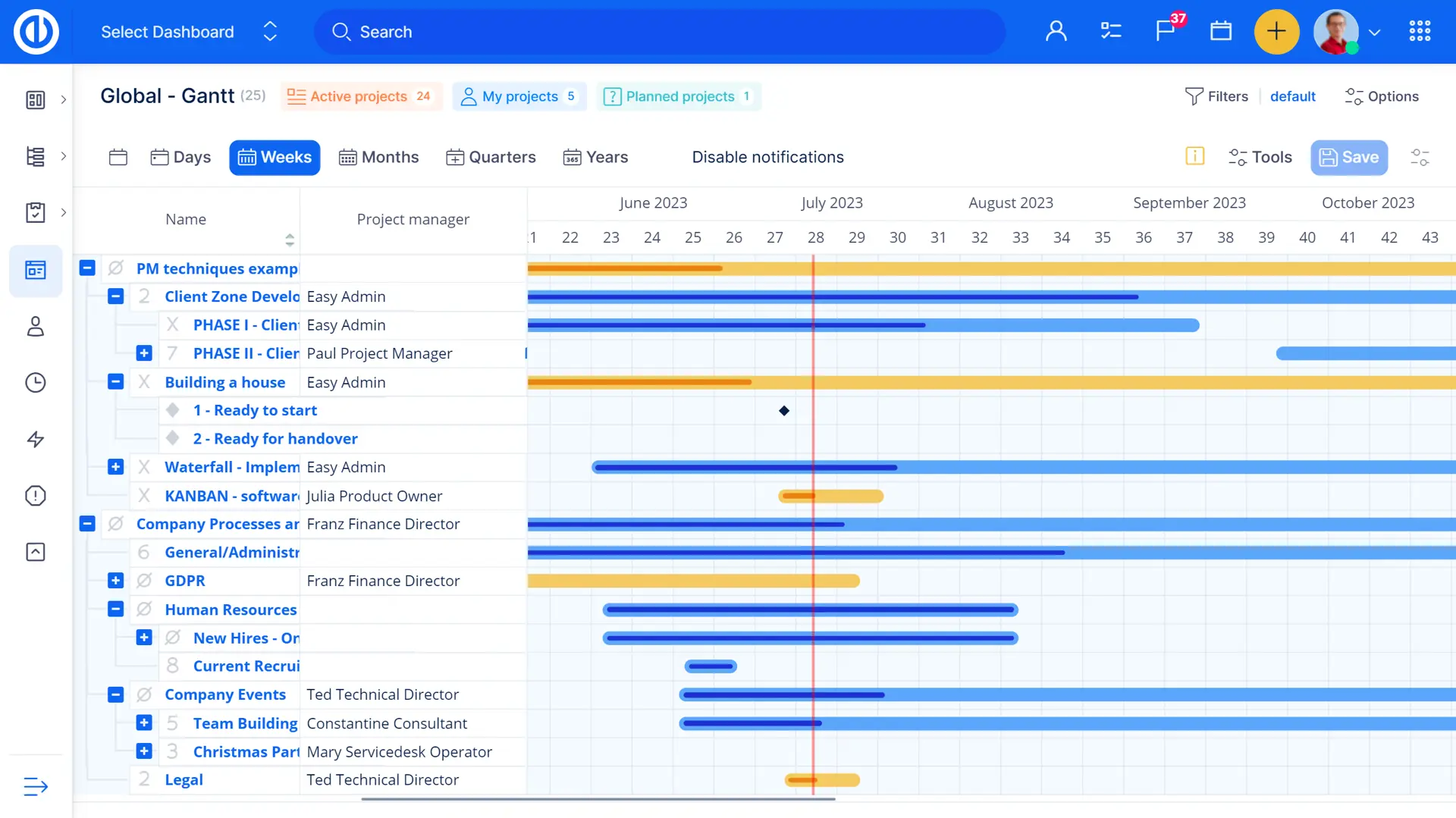 Mějte všechny své projekty organizované a snadno přístupné prostřednictvím stromu portfolia na panelu správce portfolia. Přehled aktivit a kritických úkolů vám pomůže řešit naléhavé problémy a pomocí dalších karet můžete spravovat pracovní vytížení uživatele, aktuální sprint a rozpočty. Grafy a diagramy můžete použít k vizualizaci jakéhokoli výkazu celkového výkonu.