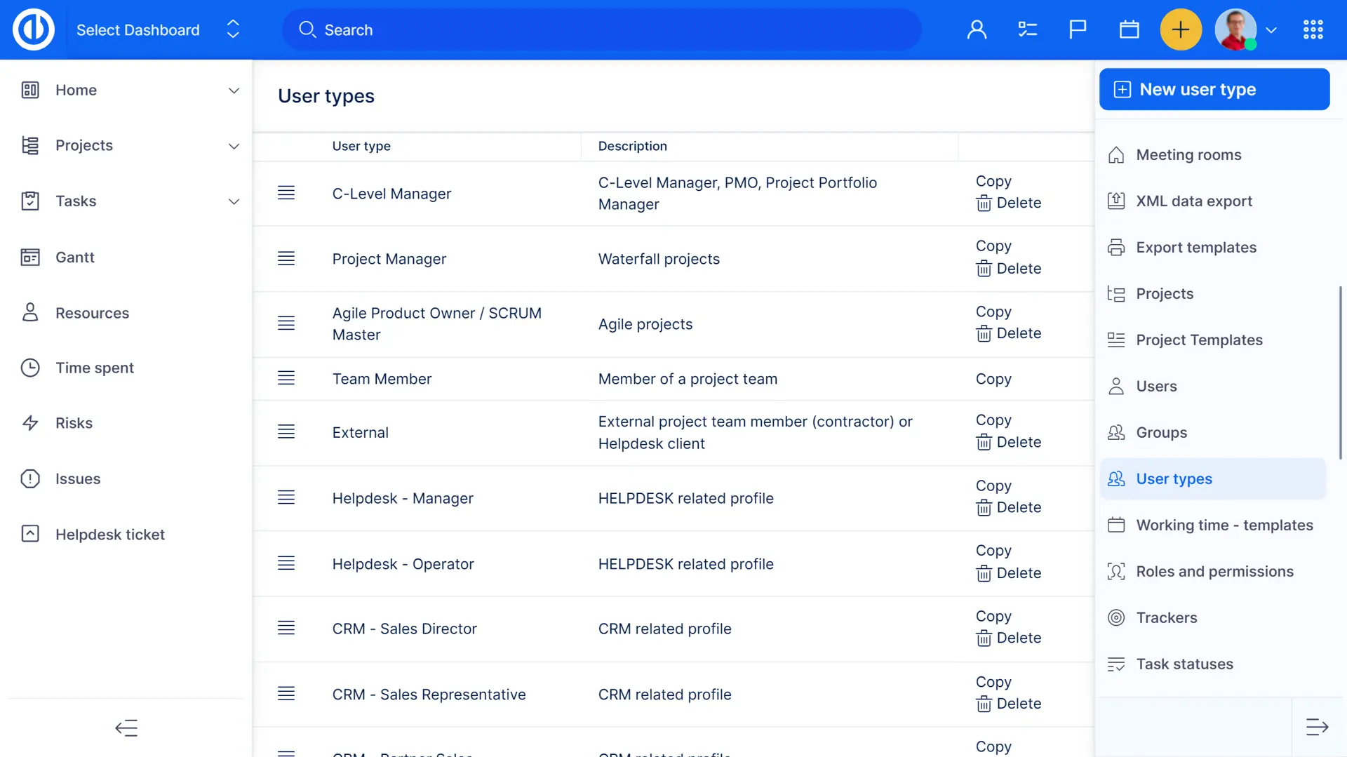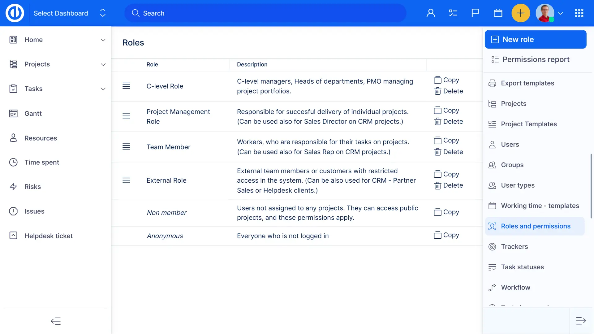 Každý typ uživatele může mít předdefinovanou výchozí roli, čímž se eliminuje nutnost přidělit roli nově vytvořeným uživatelům určitého typu. Pro zjednodušení jsou výchozí uživatelské role omezeny na několik nejčastějších rolí v organizaci. V zájmu jednoduchosti jsou výchozí uživatelské role strukturovány do 4 základních úrovní běžných rolí v organizaci. Když pozvete do systému nové uživatele, můžete mu určitou roli přidělit ještě před odesláním pozvánky. Pro každý typ uživatele je k dispozici osobní panel k okamžitému použití.