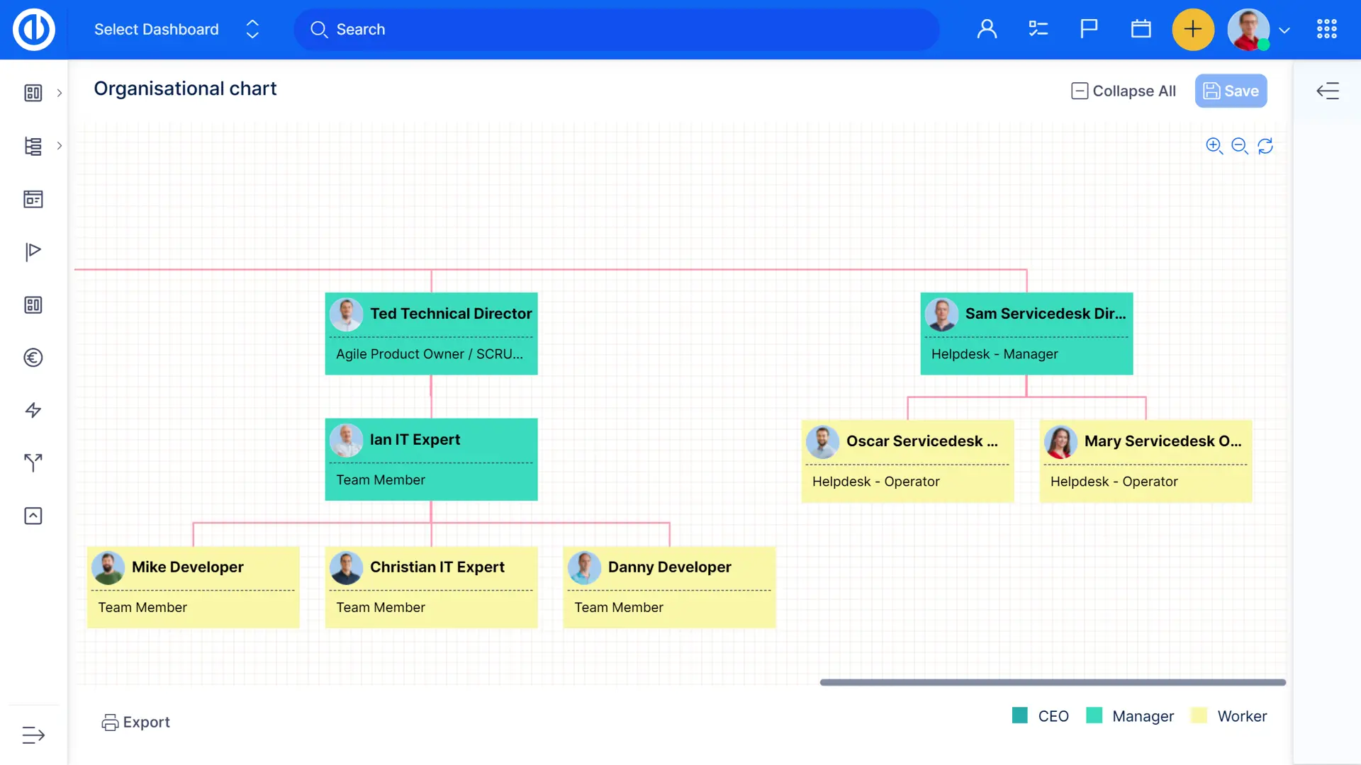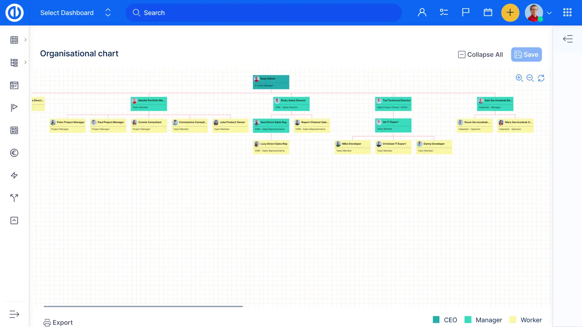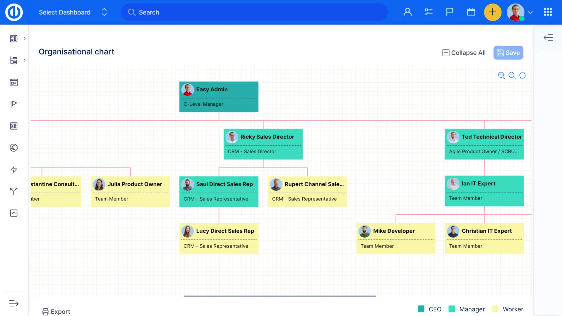 Organizační struktura je forma stromové hierarchie, kde každý uživatel v organizaci, kromě jednoho nejvyššího, je podřízený jedinému jinému uživateli. Toto uspořádání pomáhá definovat, jak jsou činnosti, jako je přidělování úkolů, koordinace a dohled, standardně zaměřeny na dosažení organizačních cílů. Určuje také, kdo je oprávněn schvalovat žádosti o dovolenou předložené uživateli.