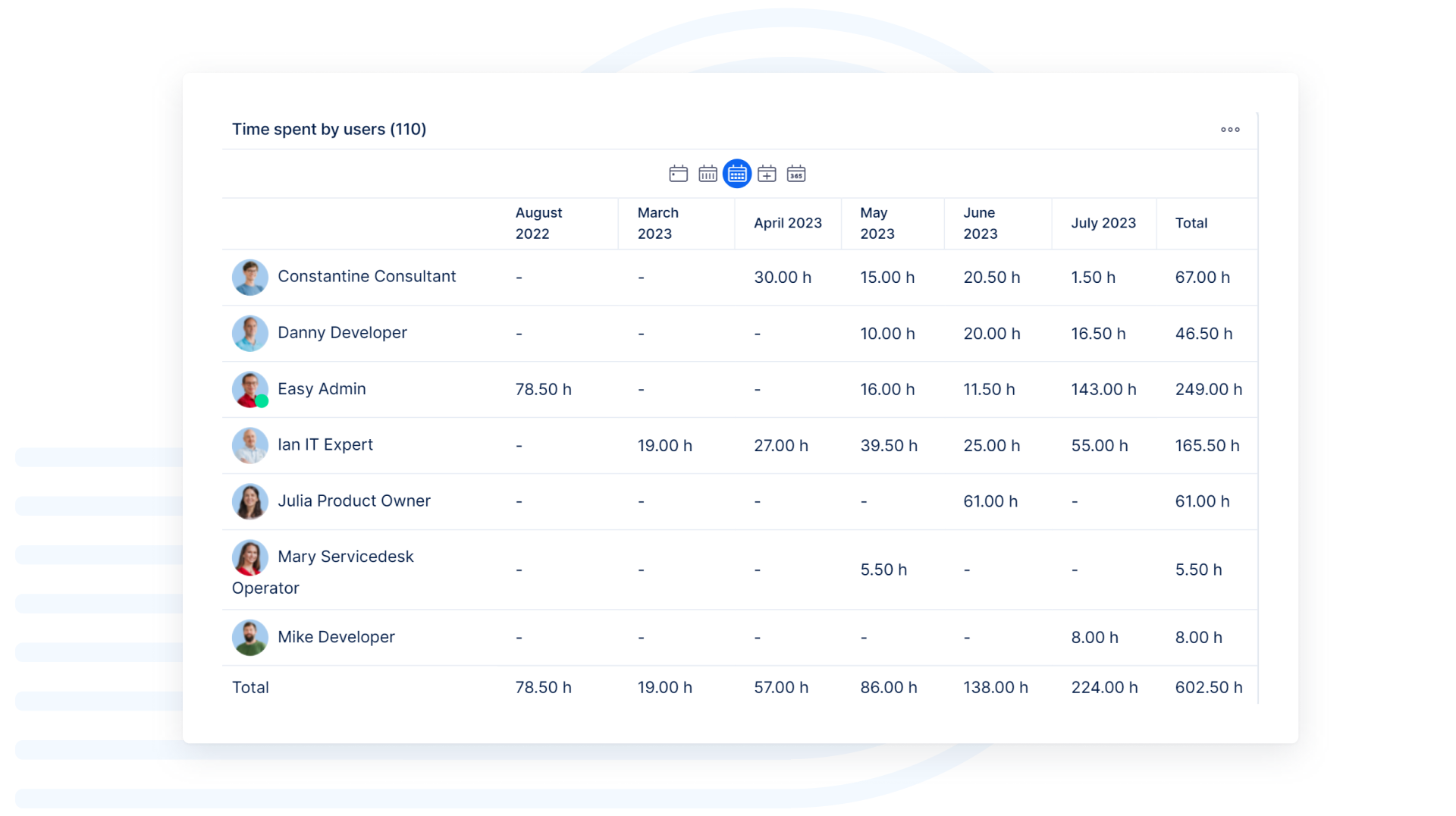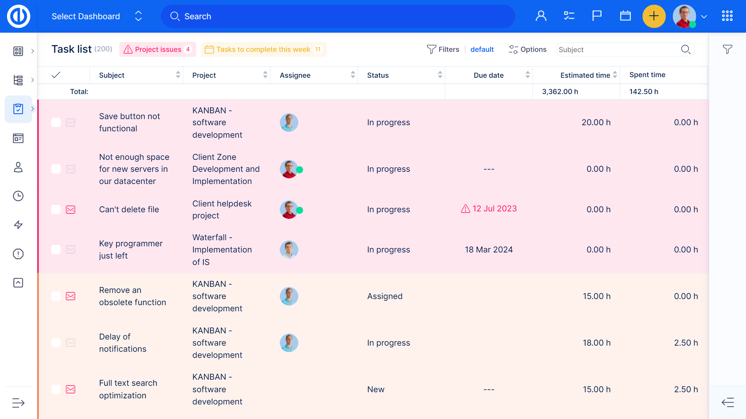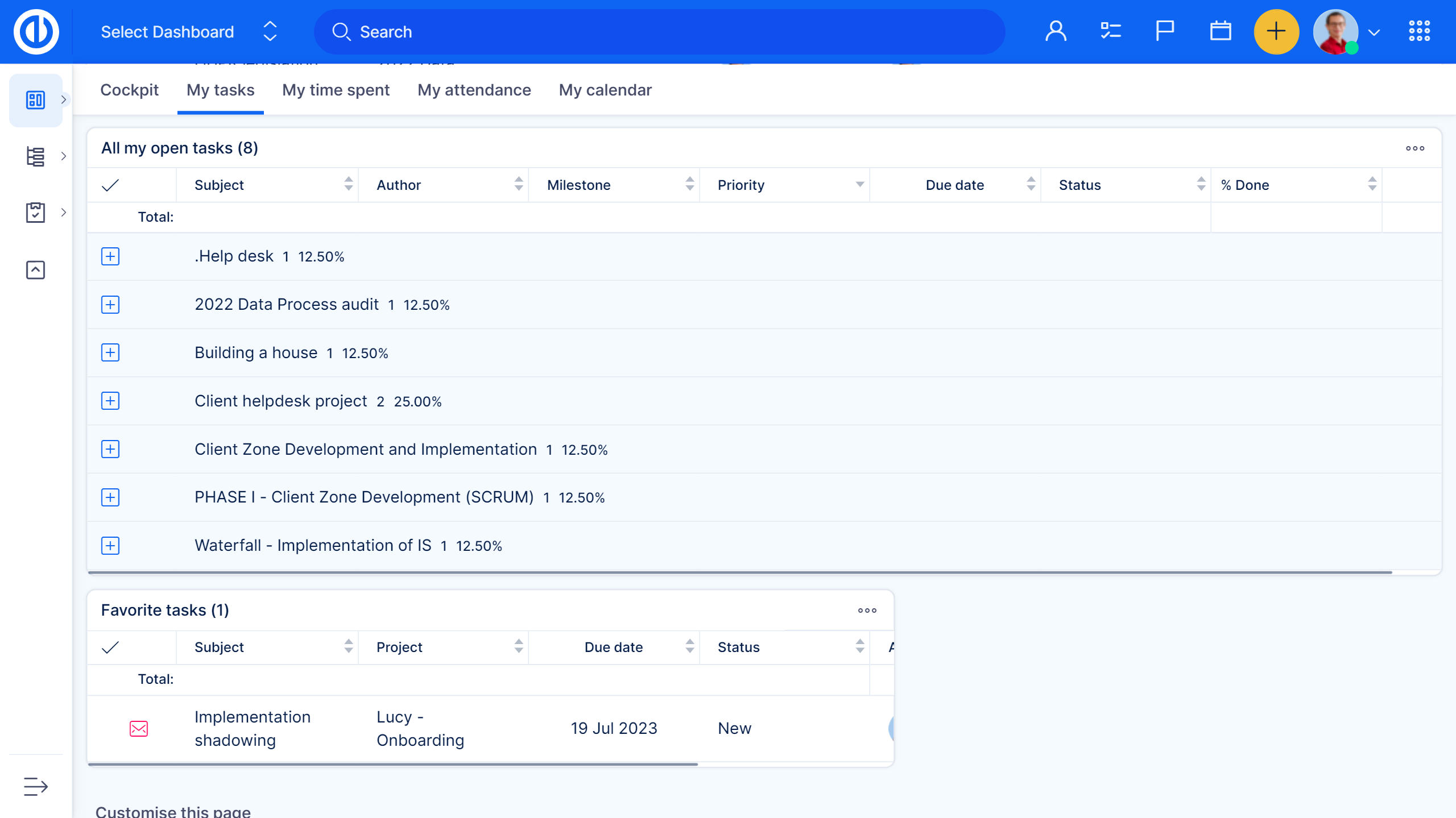 Panel lidí umožňuje na první pohled vidět informace o vašich uživatelích. Pomocí osobního panelu můžete zobrazit úkoly uživatelů a jejich stavy, stav členství na projektu, stav dokončení přidělené práce, dokončené úkoly, strávený čas, osobní náklady a mnoho dalšího!
