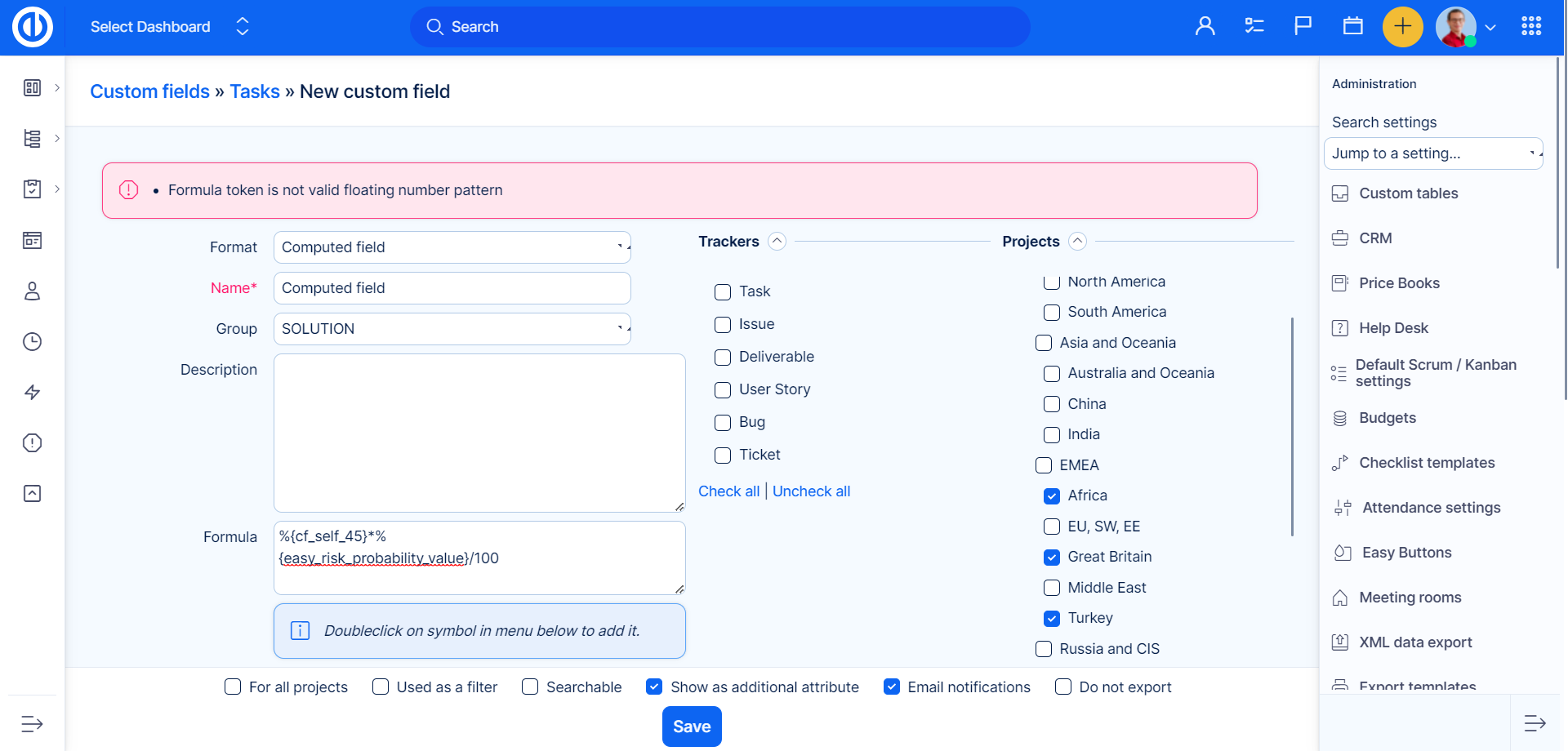 Přizpůsobte si Easy Project potřebám vašeho oddělení. Vytvořte vlastní uživatelská pole pro přidání potřebných detailů k různým typům entit. K úkolu či projektu snadno nastavíte vlastní pole, které se vypočítá z jiných hodnot. Například: k úkolu vytvoříte pole "zbylý čas pro realizaci" = předepsaný čas - vykázaný čas.