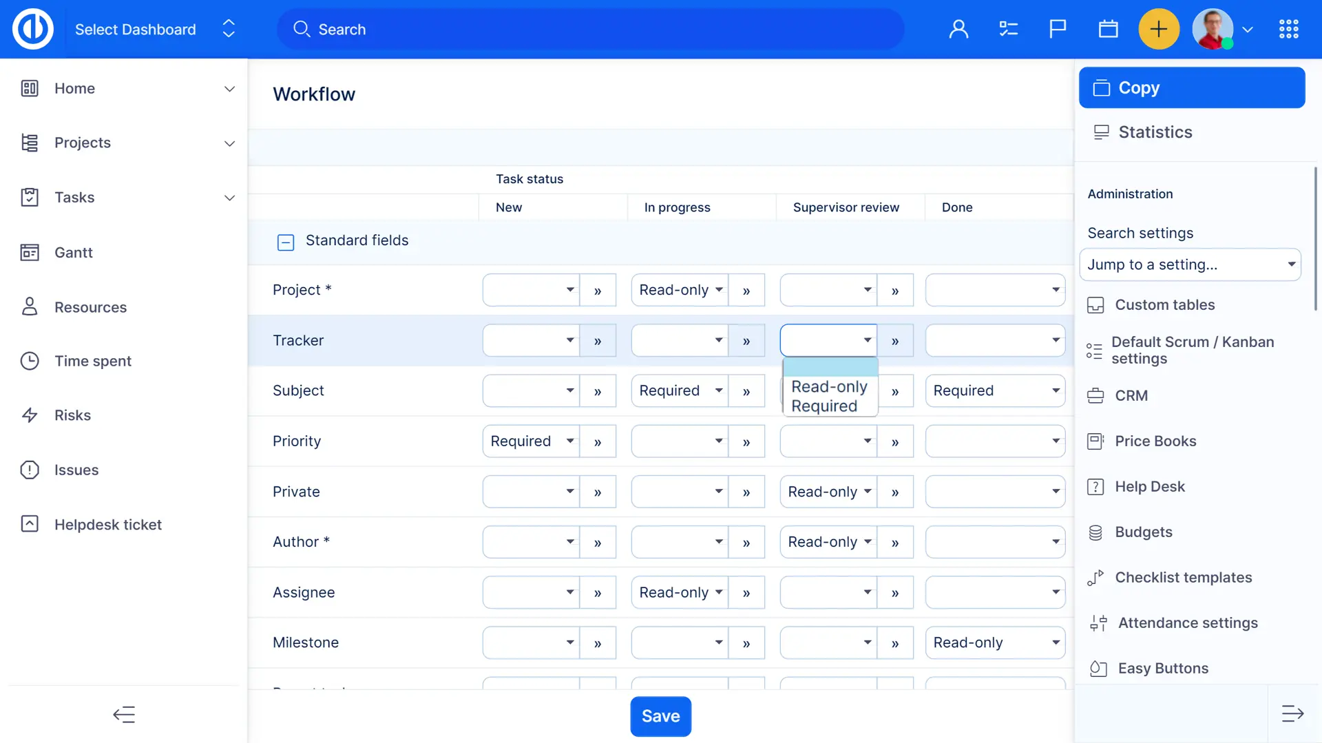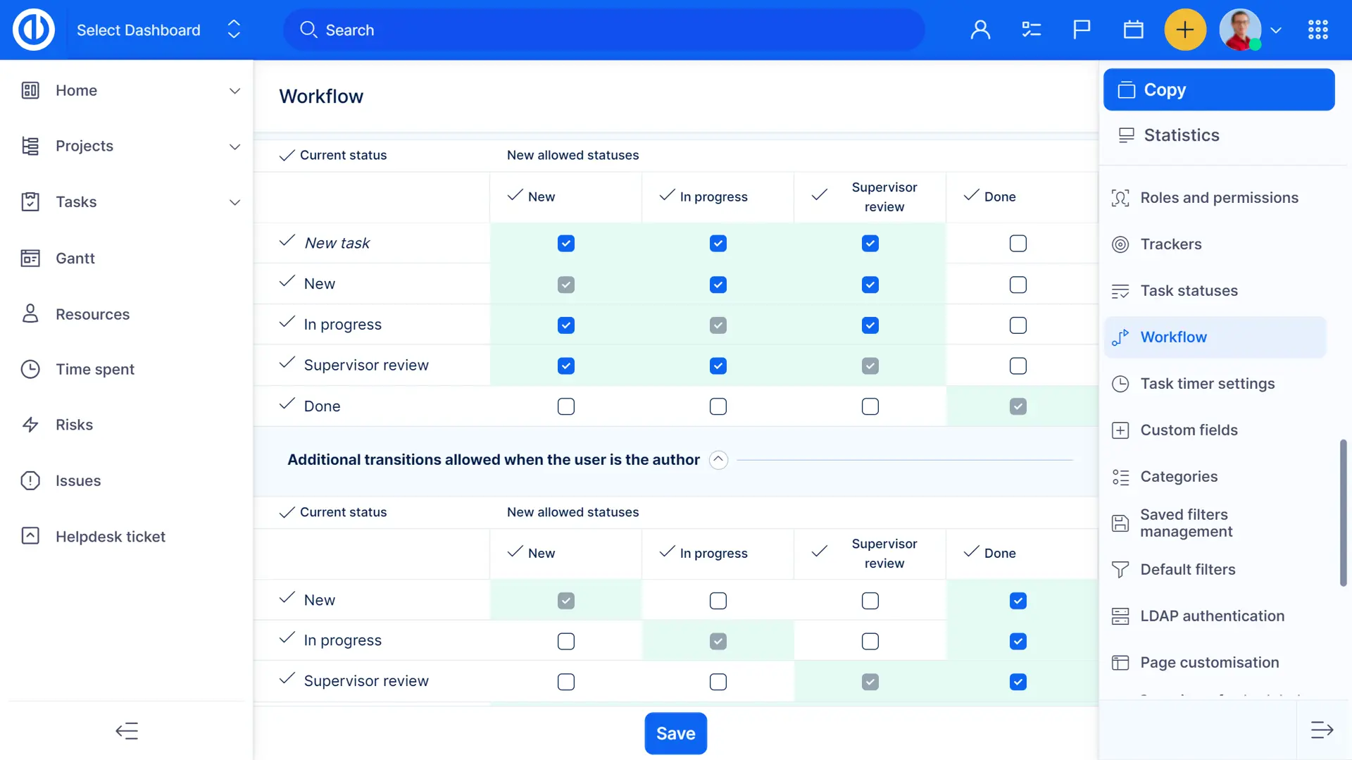 Workflow umožňují definovat, provádět a automatizovat podnikové procesy, eliminovat chaos a koordinovat úkoly mezi zaměstnanci. Easy Project umožňuje nastavit oprávnění a pracovní postupy založené na typech uživatelů.